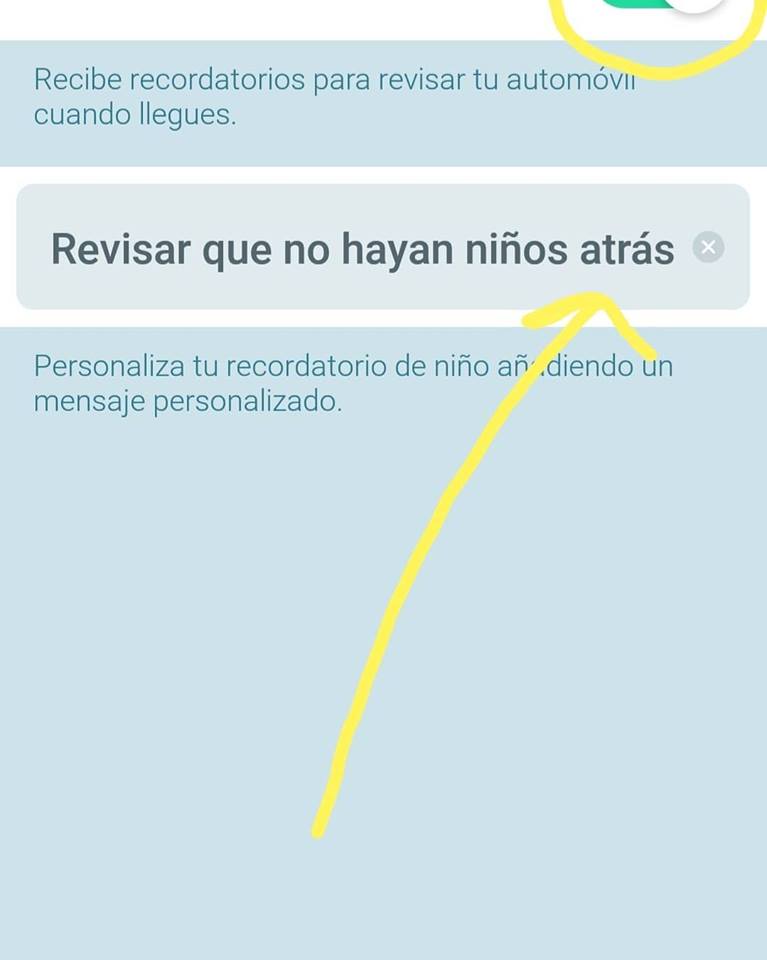Se trata de un Recordatorio de Niño, el cual al llegar al destino, muestra en pantalla el recordatorio de que puede haber un niño con nosotros junto a un mensaje personalizado.